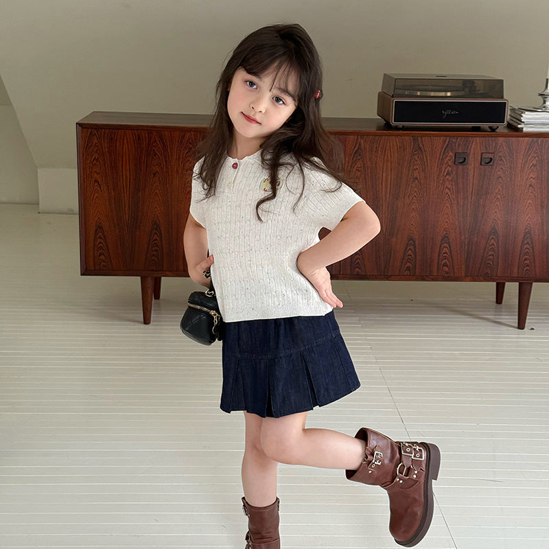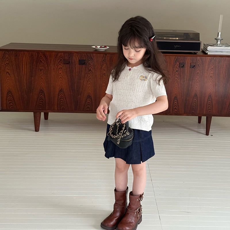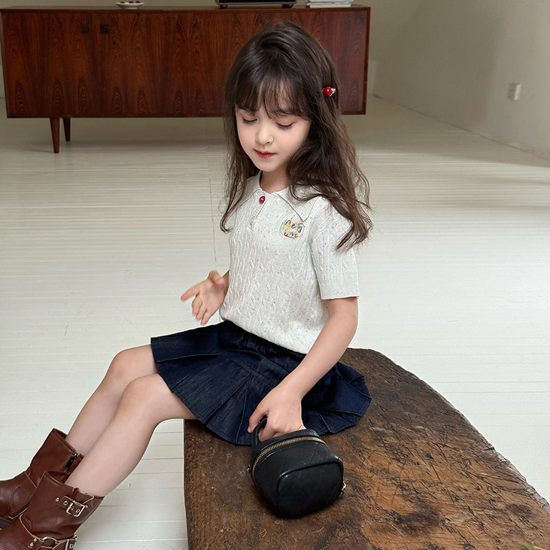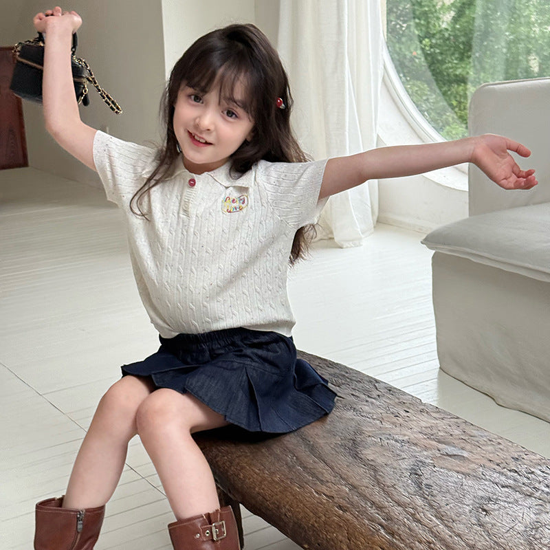 Girls’ Knitted Short-Sleeve POLO T-Shirt Letter Embroidery