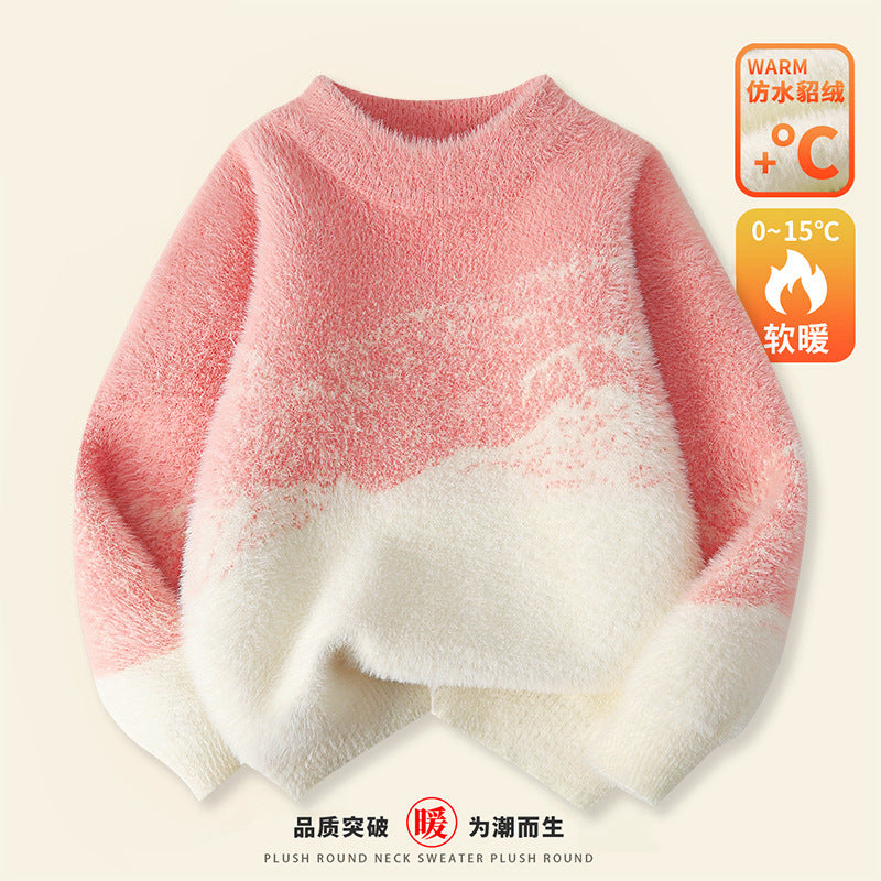 The gradient color design adds a fun and trendy touch, making your child stand out whether at school, family gatherings, or outdoor adventures. Its classic knitwear style with a comfortable bottoming shirt fit makes it versatile enough to wear on its own or layer under jackets and coats.