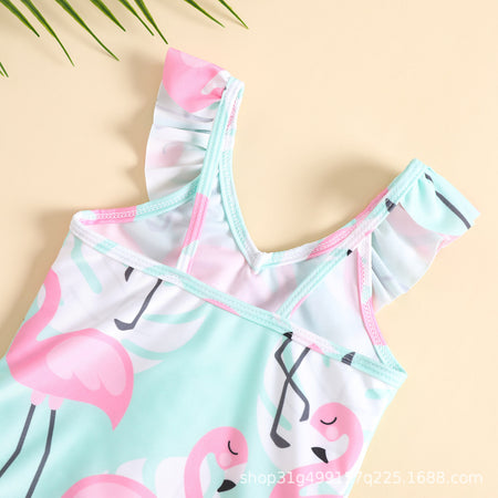Flamingo Print Girls’ Swimsuit – Cute V-Neck Beachwear