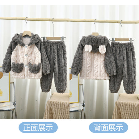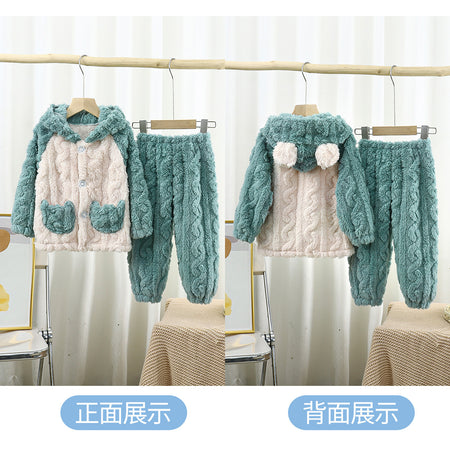 Made from soft, thickened flannel, it provides excellent insulation while remaining gentle on delicate skin. The hooded long-sleeve top keeps kids warm from head to wrist, while the matching pants with flap pockets offer practicality and style. The cartoon design adds a playful and fun element that children will love, making it ideal for both boys and girls.