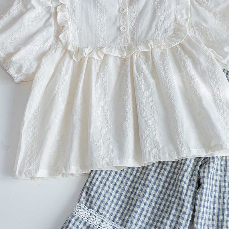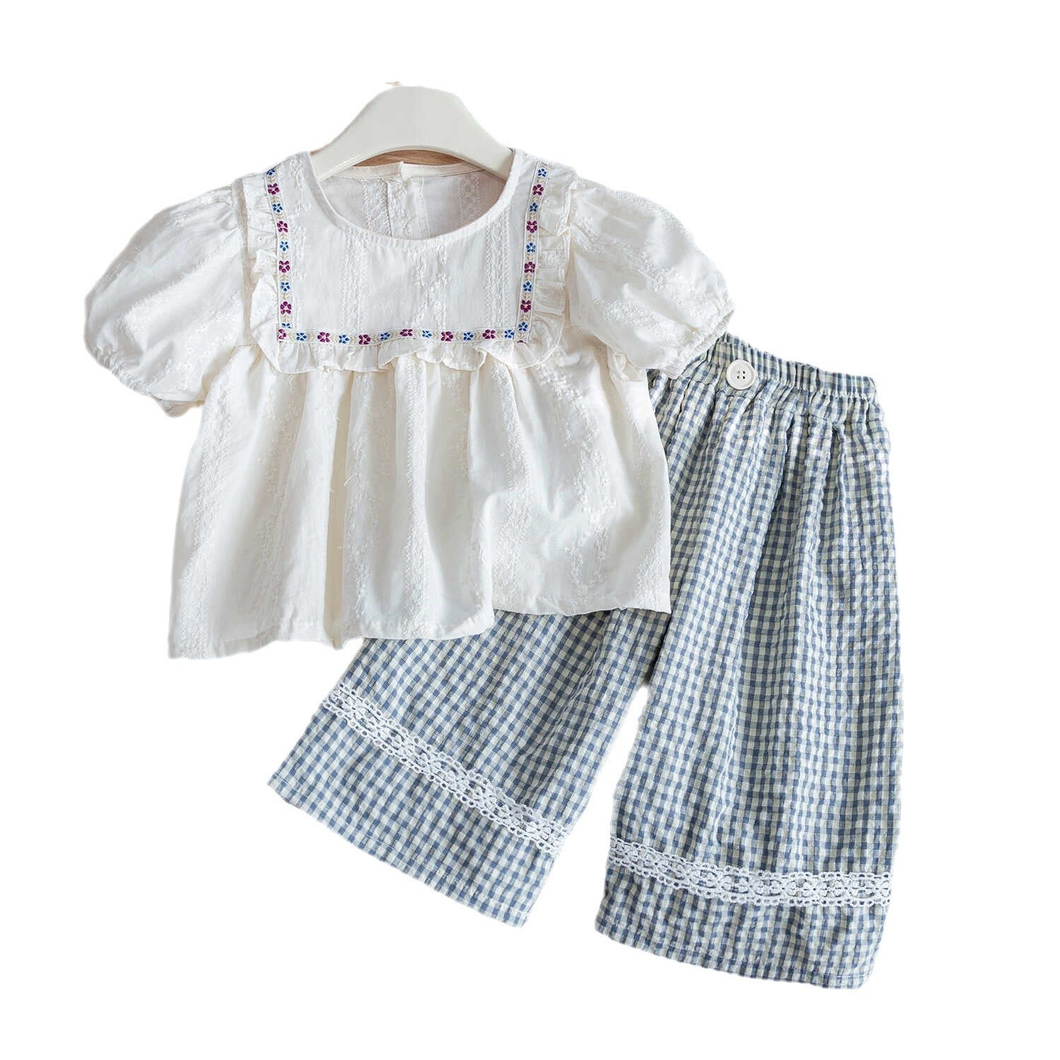 Complete 2-Piece Outfit: Embroidered doll-style shirt + plaid straight-leg pants.