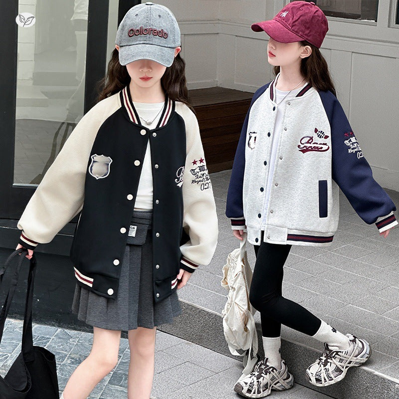 Bring a splash of fun and fashion to your child’s wardrobe with our Girls’ Contrast Color Baseball Jacket—the perfect spring and autumn outerwear. Designed with playful raglan sleeves and trendy detailing, this jacket is both fashionable and functional.
