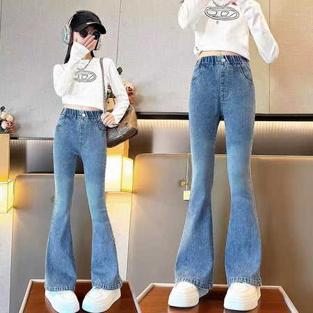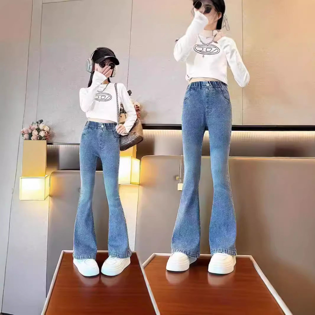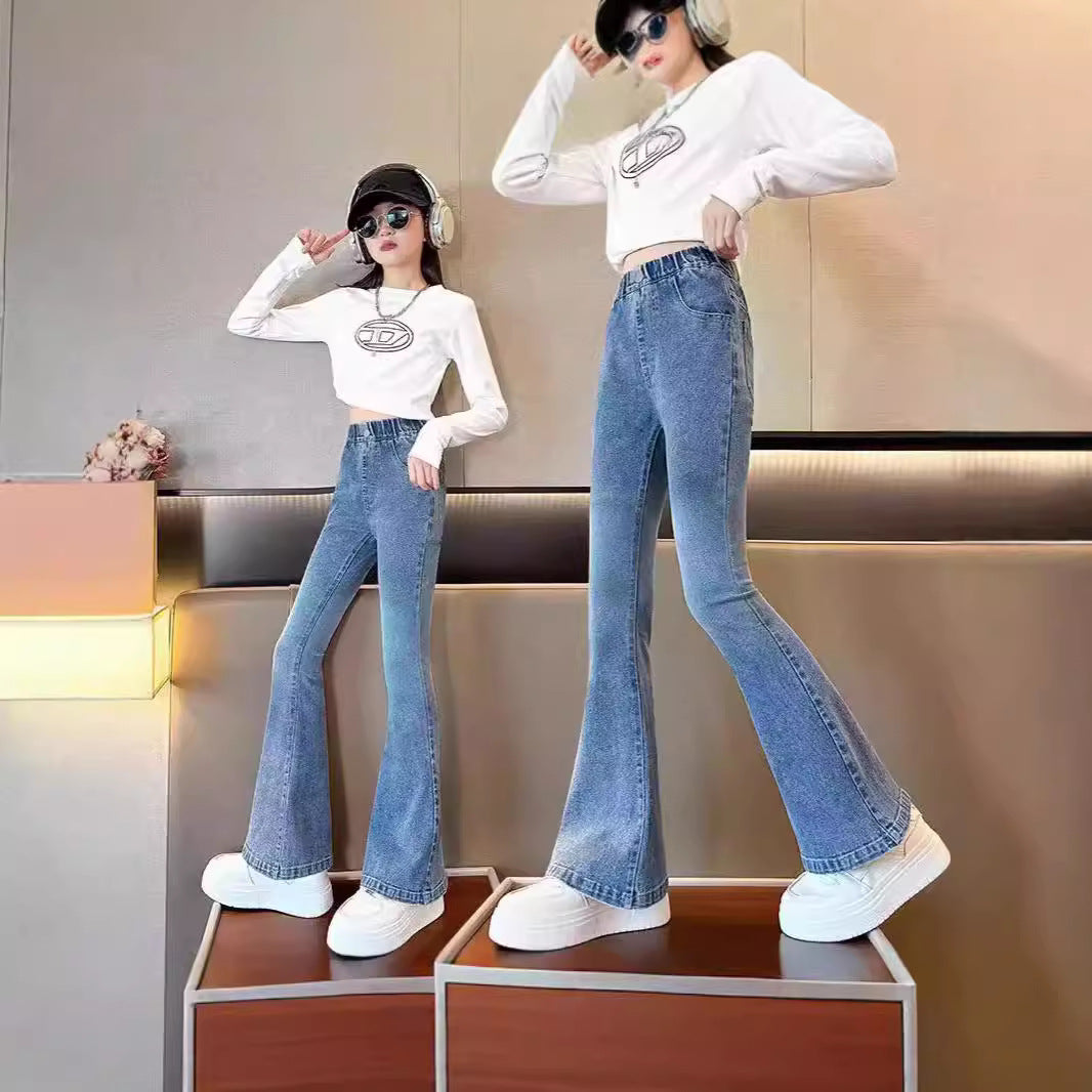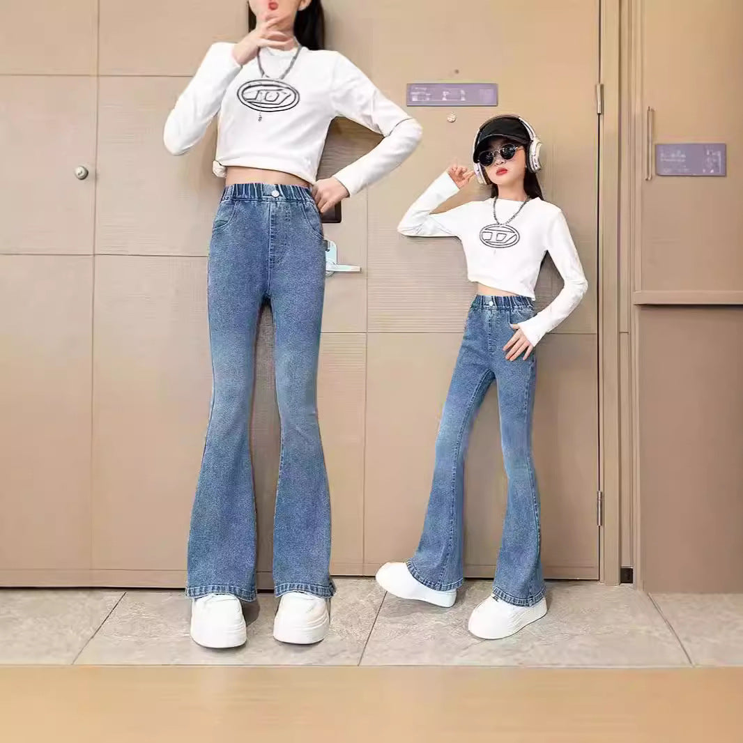 Add a stylish twist to your child’s wardrobe with these girls’ bell bottom jeans 👖✨. Perfect for spring and fall, they feature a Korean-inspired slim fit that gently flares at the hem, creating a trendy and flattering silhouette for medium and large children.