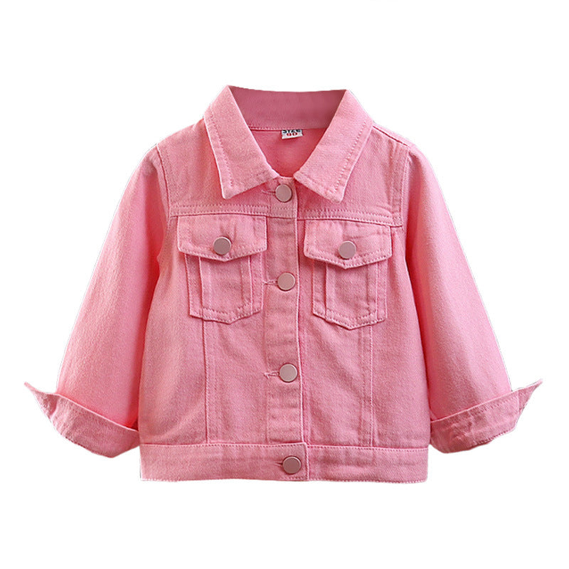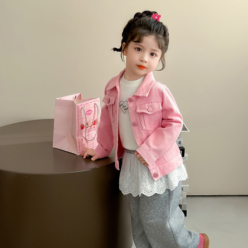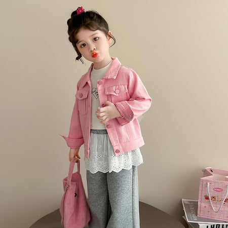 Add a pop of color to her wardrobe with this pink denim jacket for spring and autumn 2025. Cute, stylish, and versatile—it’s designed with a Korean princess-inspired flair that little girls adore. 💖