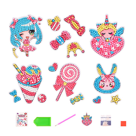 Each set includes a variety of colorful diamond stickers with random cute designs—think animals, stars, fruits, and more! Simply peel, stick, and press the tiny diamonds onto the marked areas to complete sparkly, stunning creations 🌟🎉