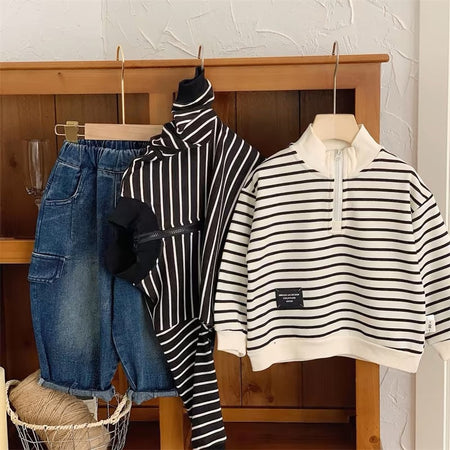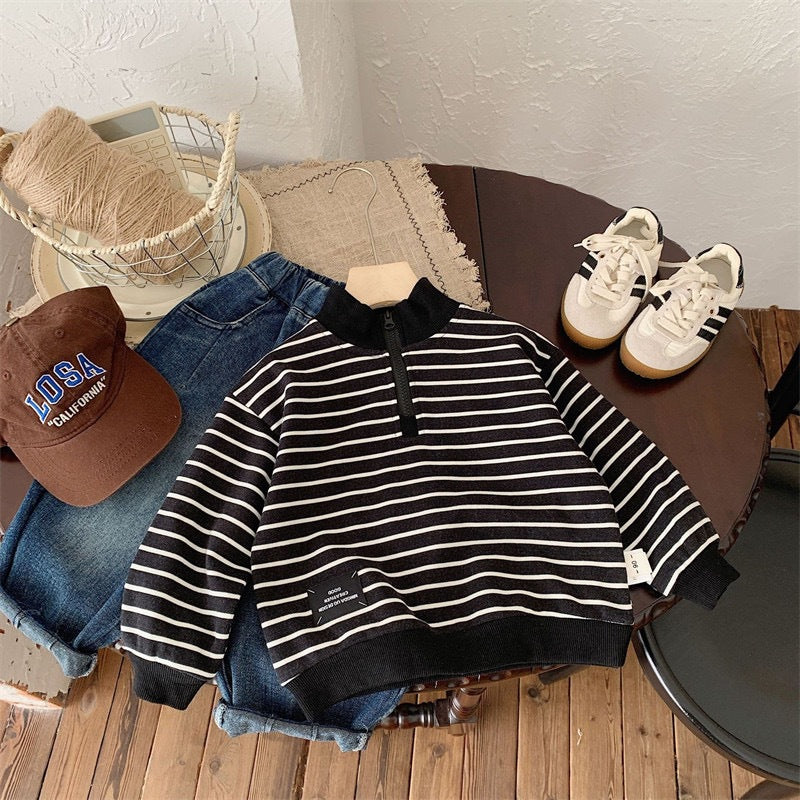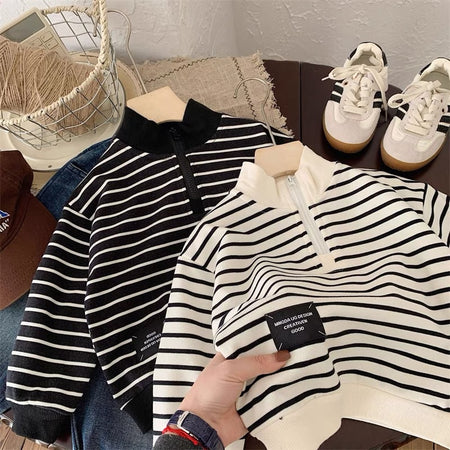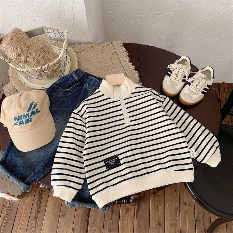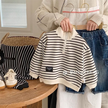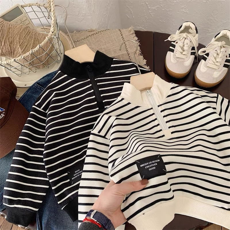 🌸👶 Refresh your child’s wardrobe with the 2025 Spring Korean New Arrival Children’s Striped Zipper Collar Pullover — a stylish, casual top perfect for boys and girls in Nepal. Designed with a trendy Western influence, this pullover blends comfort and fashion effortlessly.