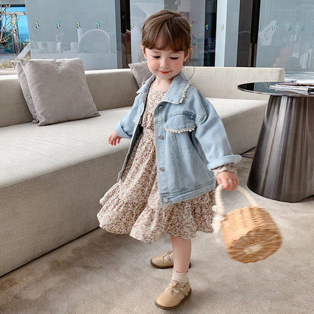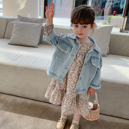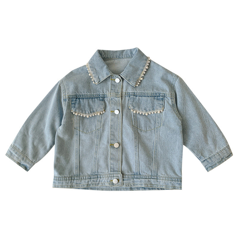 Korean style girls' spring new children's Pearl Denim coat baby spring and autumn jacket Western style cardigan denim jacket