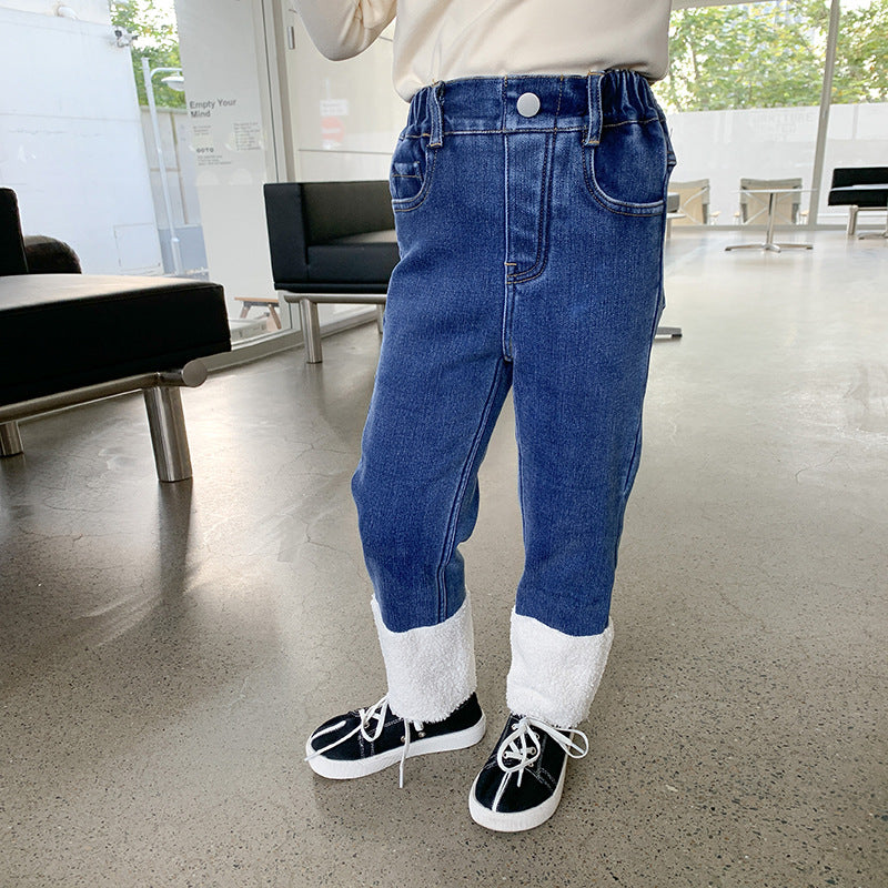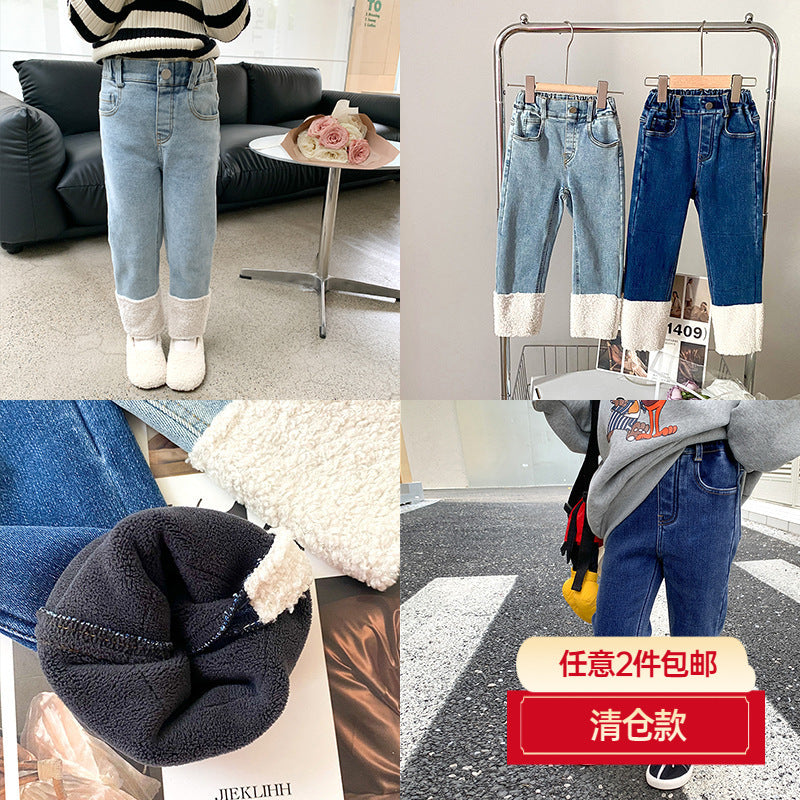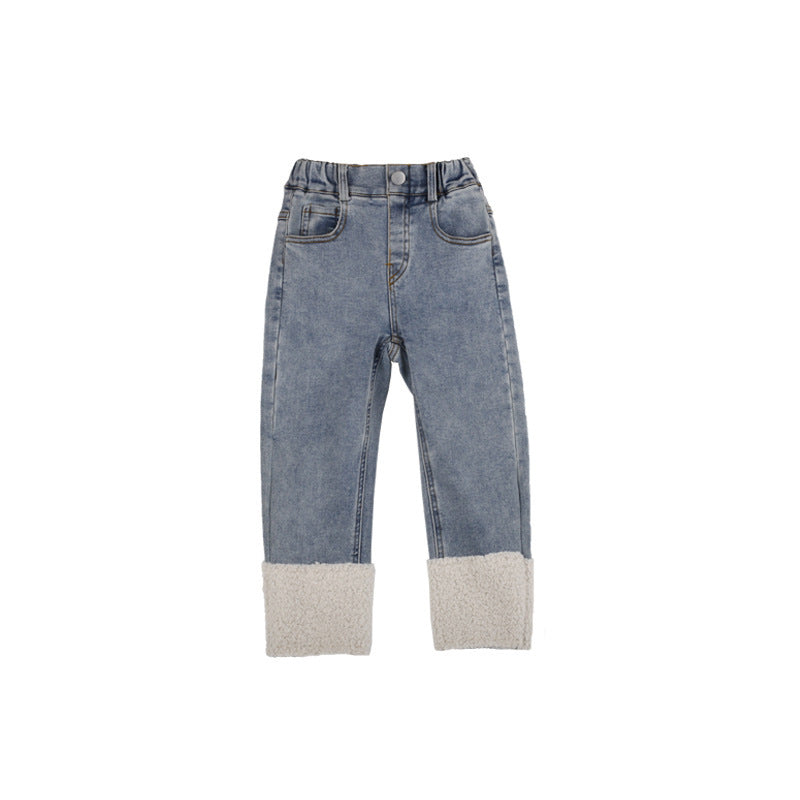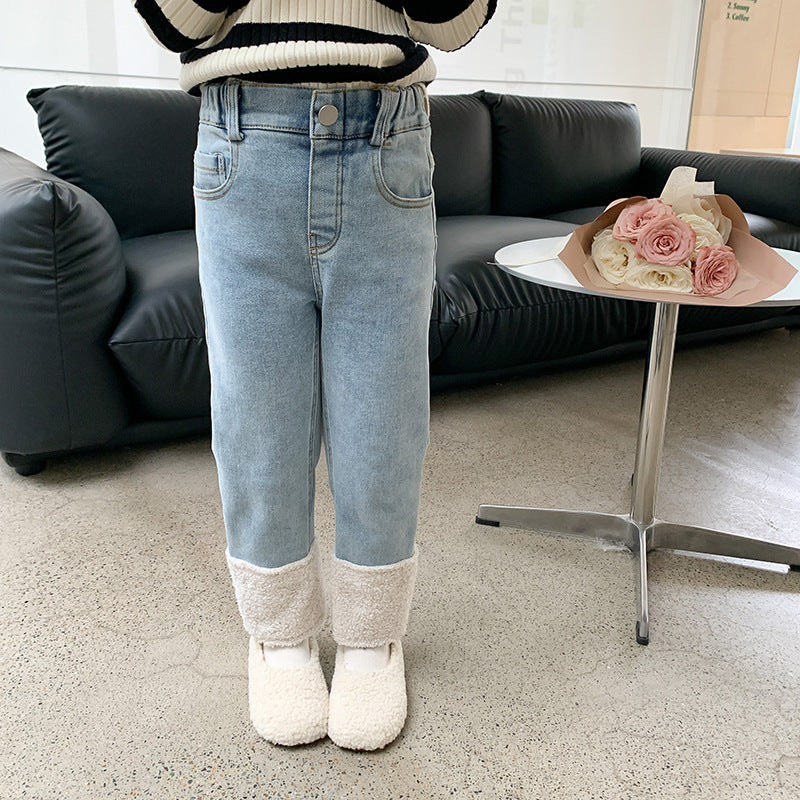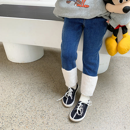 Keep your child cozy and stylish with these girls’ slim straight-leg contrast jeans 👖❄️. Designed with a composite one-piece construction, they feature a soft velvet lining and imitation lamb wool interior for maximum warmth during chilly days.