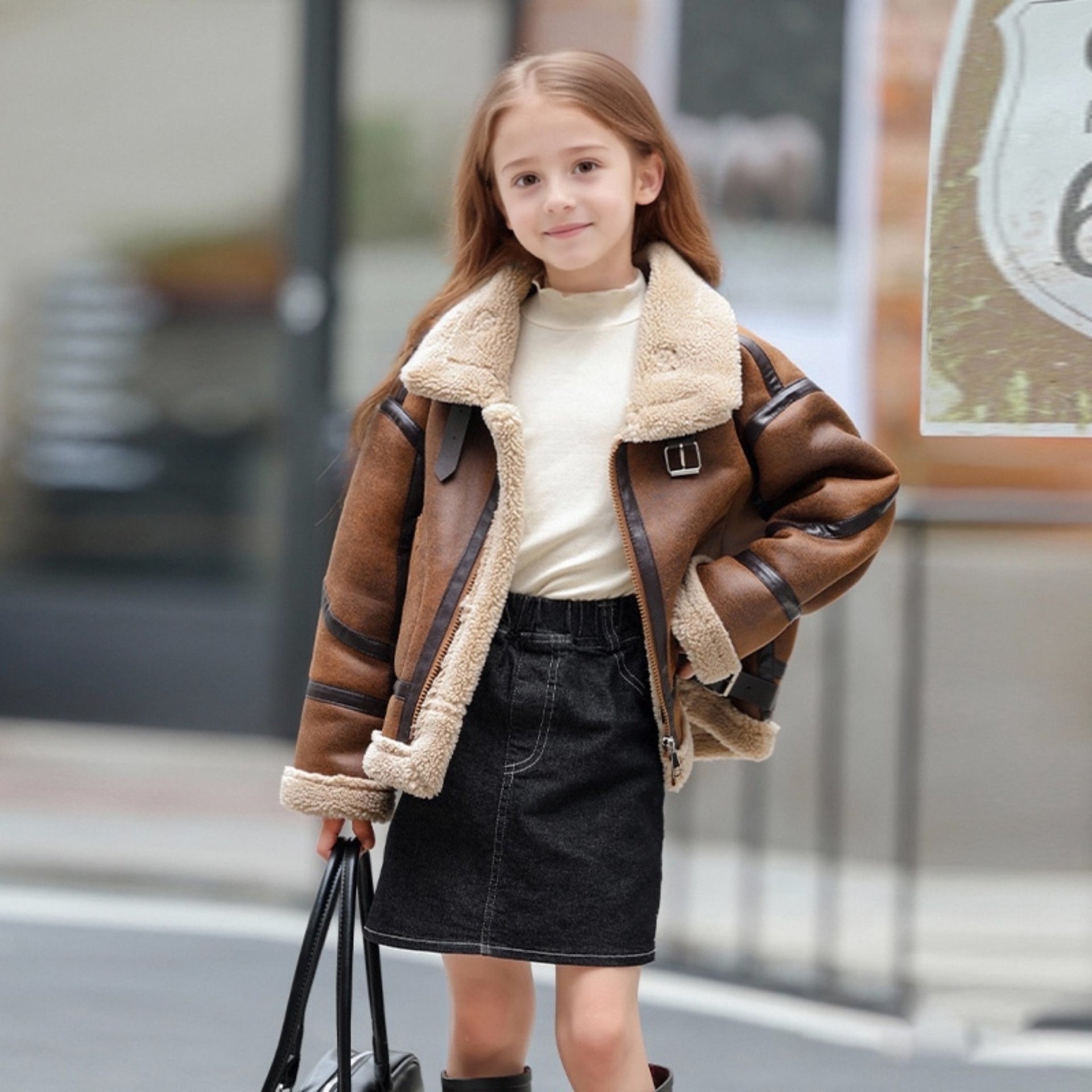Perfect for autumn strolls, winter school days, or casual outings, this jacket provides warmth and a timeless look. Its fur integration offers insulation, while the suede style adds a fashionable edge.