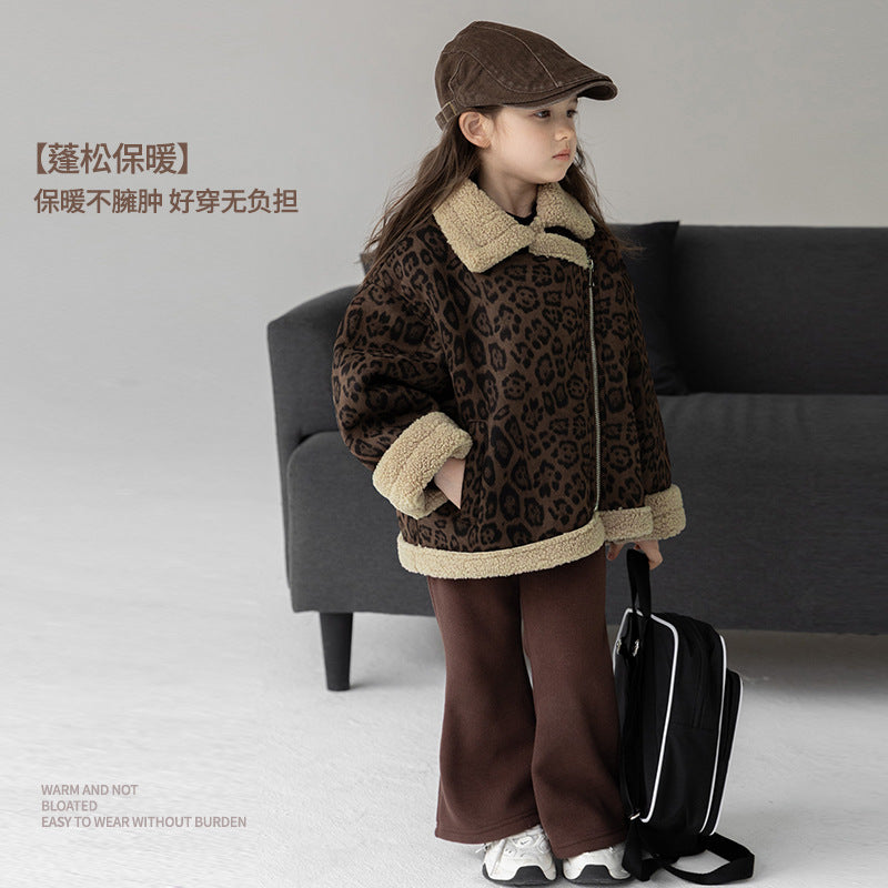 Girls’ Leopard Print Jacket – Warm Fleece Winter Coat
